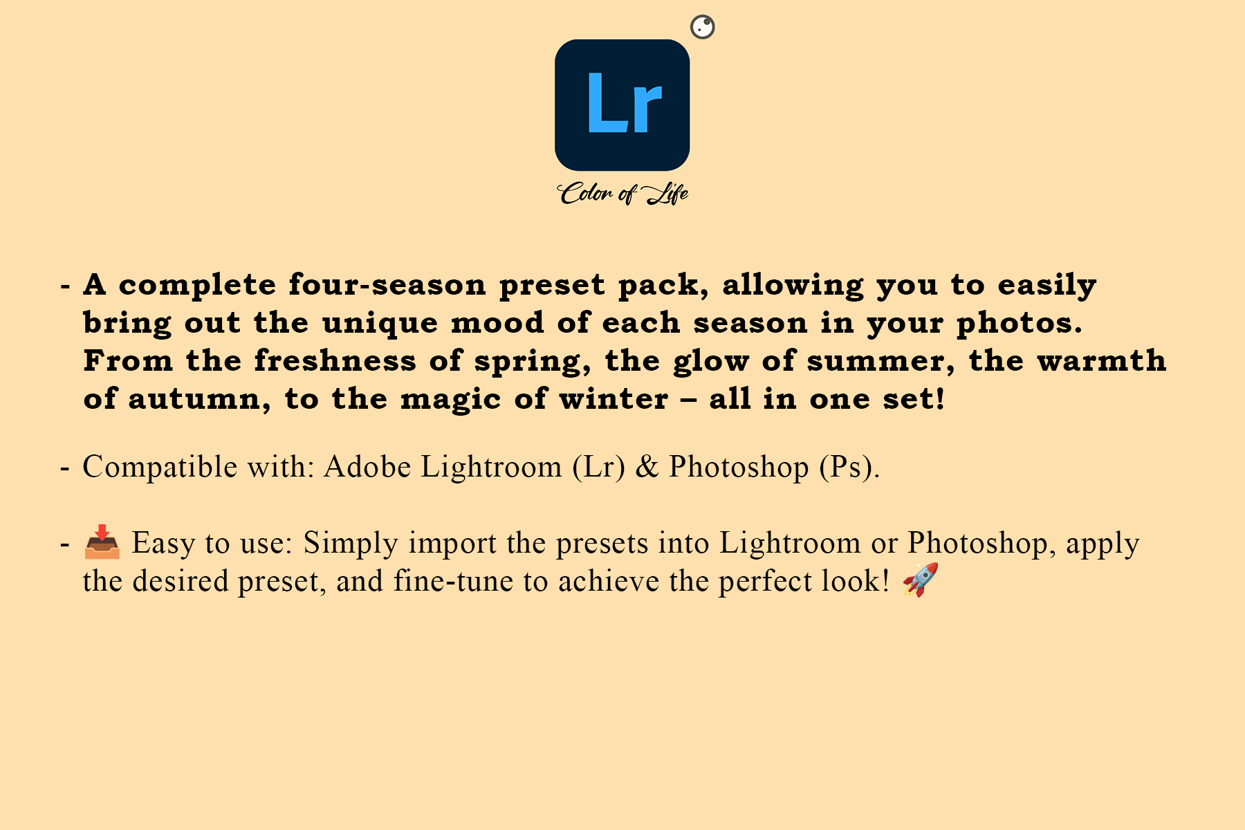 Our presets aren't just about changing colors. They're about capturing the mood, the moment and the memory. With just one tap, your photo feel more alive. no editing skill needed and adapted to lightroom mobile and desktop, crafted with seasonal tones and vintage vibes, they're fast, easy and perfect for photographer, memory keepers. "presets aren't just about color - they're about keeping memory alive."