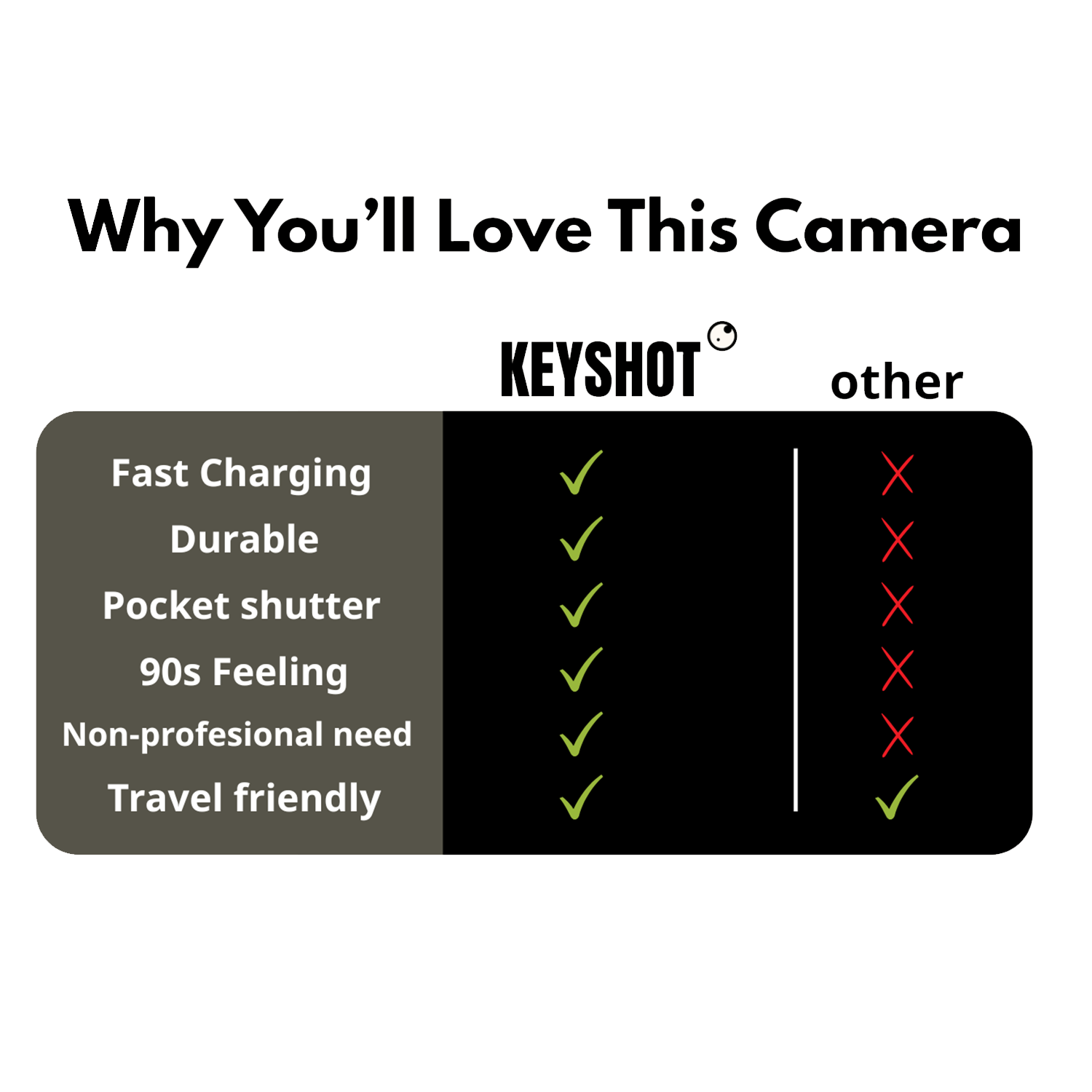 Get that dreamy retro look without digging up your old camcorder. This mini cam delivers vintage-style videos and photos with soft, nostalgic tone- just like a tiny VHS recorder. Add some personality to your everyday carry and never miss a memory again.